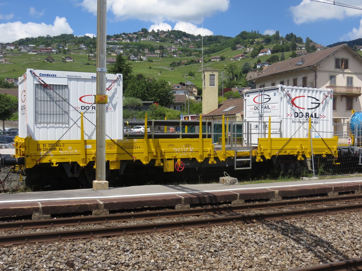 Wagon plat à bogie de Duvoisin Groux avec deux conteneurs. le wagon à été modifié pour en faciliter l'accès.