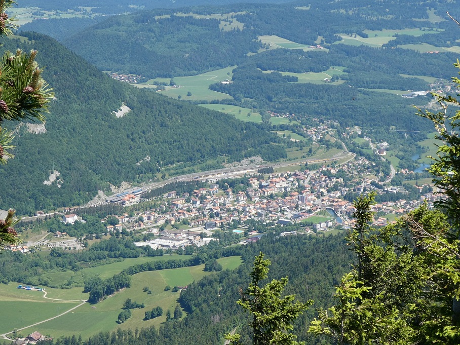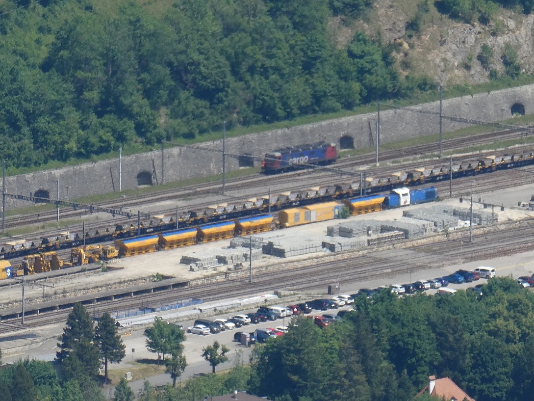 Dans le Jura suisse, du sommet du Vaulion à 1500 mètres d'altitude, en plongée sur la gare de VALLORBE (Suisse), des trains de travaux stationnent en gare