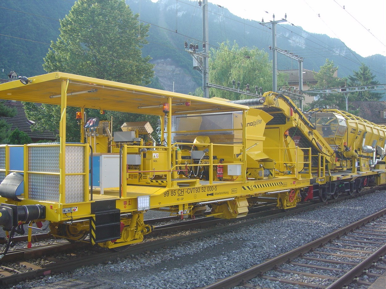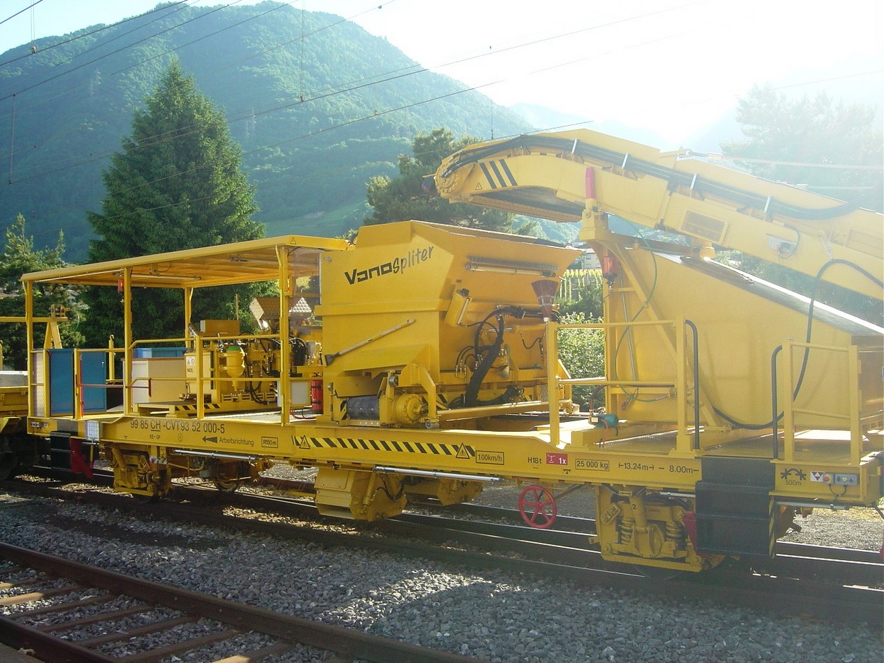 Voici le VanoSpliter. Ce wagon spécial est utilisé pour le ballastage. Utilisé avec les wagons MFS100, il sert au ballastage de la voie après réfection lorsque la demande en ballast est importante. Les VAD décharges dans une trémie munie de trappe télécommandée.