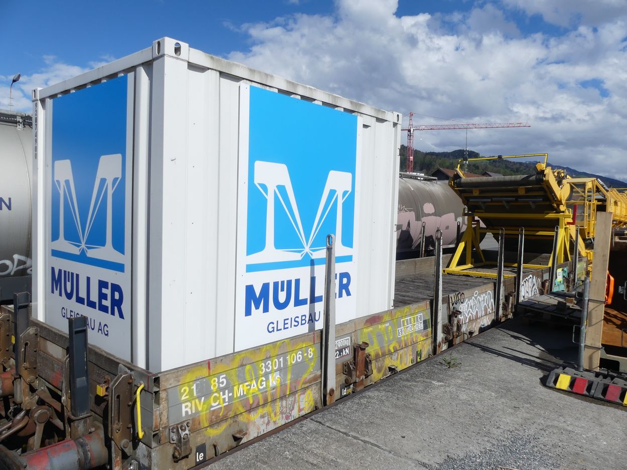 Voici un wagon de protection plat à deux essieux de l'entreprise Muller Gleisbau AG