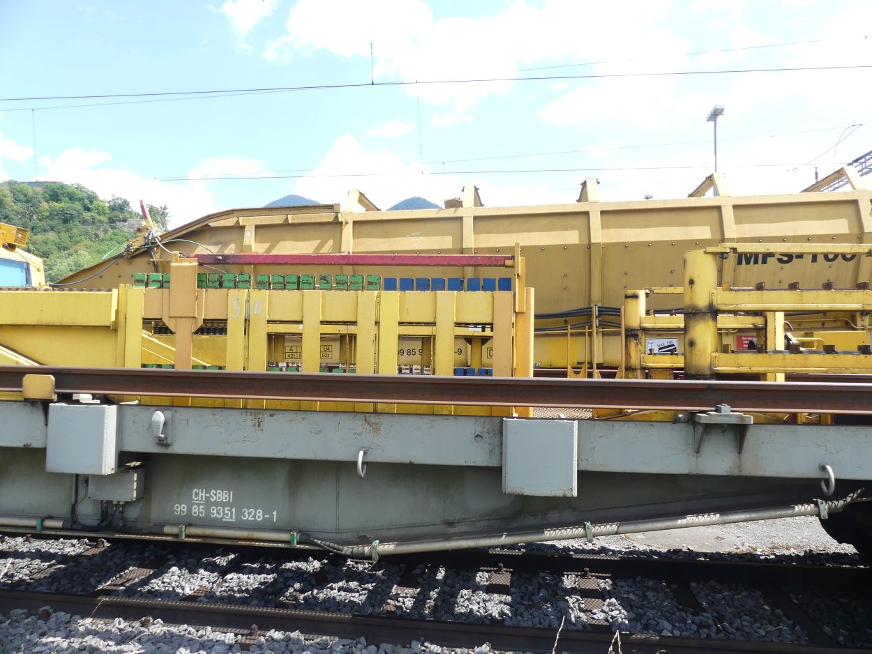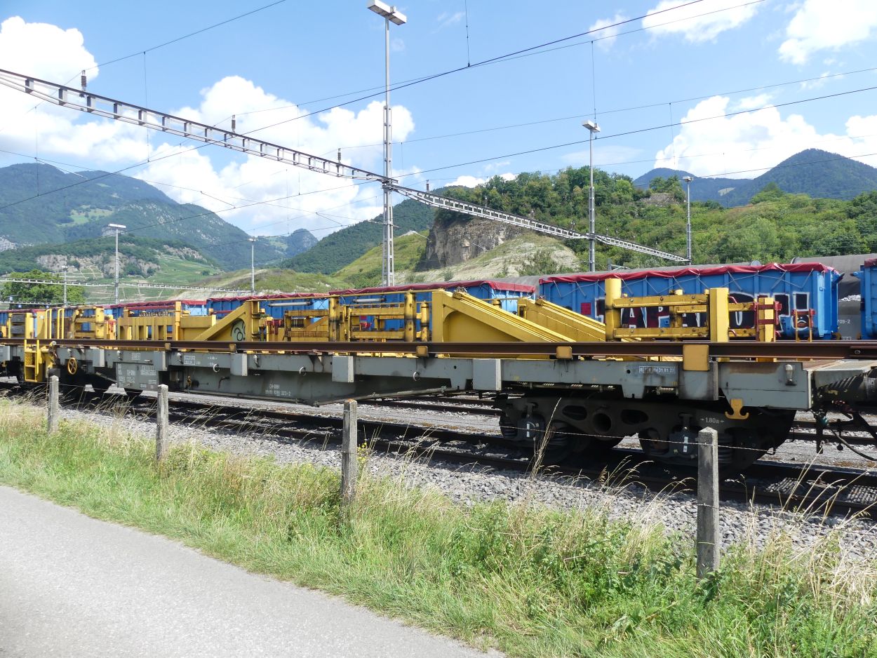 Voici l'un des trains de transport de longs rails de 108 m, numéro 13. Ces trains peuvent transporter des longs rails soudés de 108 m maximum, la longueur utilisée en Suisse.