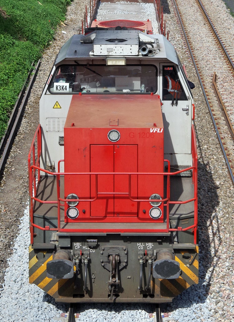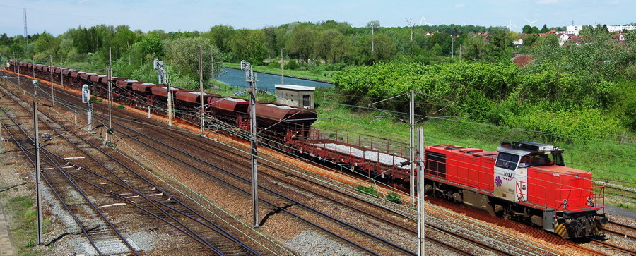 La voici sur un train de TXX n°K3KA photos de Gtr Lefèvre le 27 avril 2018 depuis le pont routier de la D17 à Canisy (80) pour du ballastage