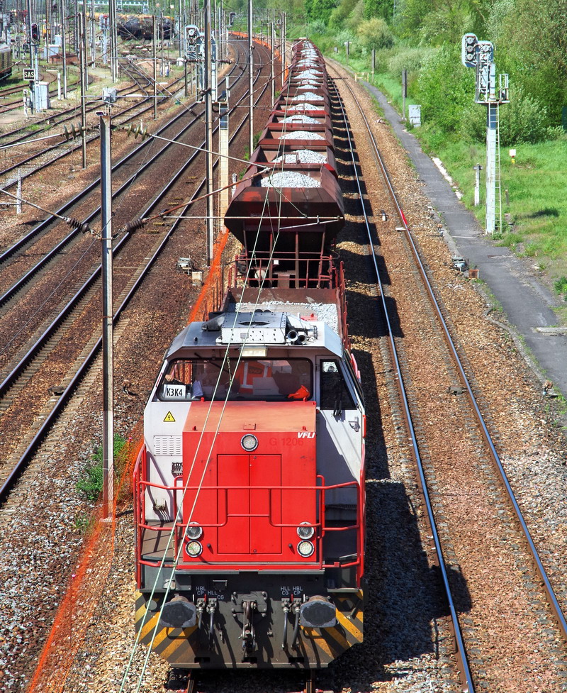 la voici le 02 mai 2018 à Tergnier (02) de passage sur un train de TTX n°K3K4 avec des trémies D12 de ballast