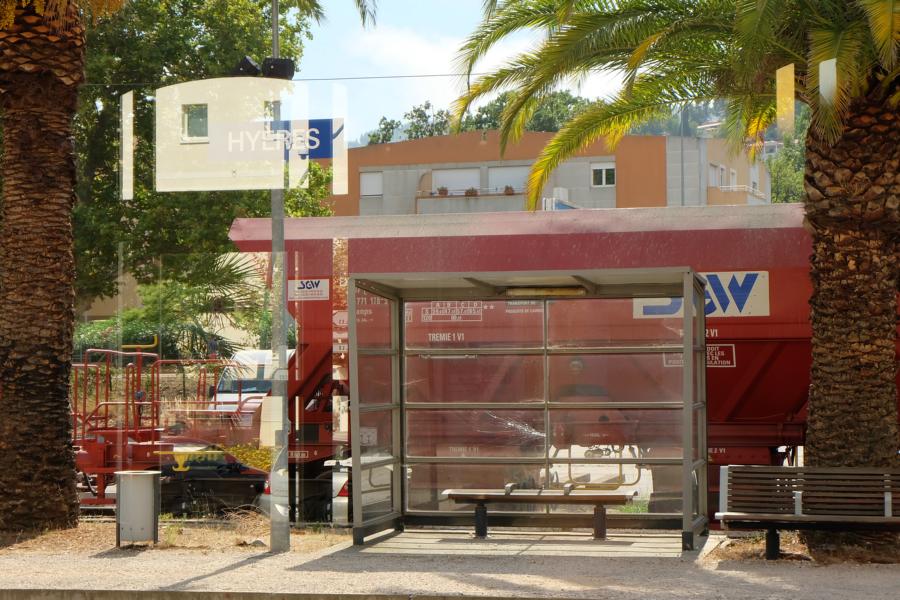 Wagon trémie présent en gare de Hyères le 9 septembre 2014 dans une rame de 10 wagons. Désolé pour la qualité de la photo, la partie de la rame côté Toulon n'était pas très bien accessible.