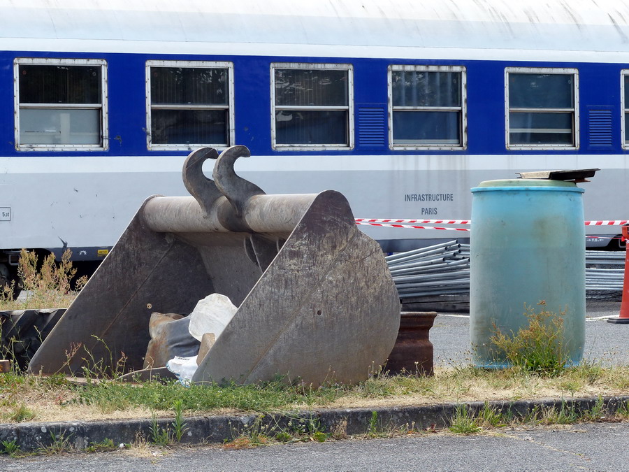 Bonsoir, le 27 Juillet 2014, des travaux ont été réaliser à Alstom Aytré, à côté de La Rochelle, sur une voie de garages pour les tramways et voitures de TGV (avant l'assemblage des rames) finis, j'ai pu prendre en photo la pelleteuse qui prenait des vieilles traverses.