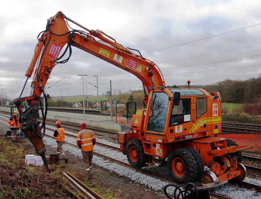 La voici en gare de Mennessis (02) dans le cadre du RVB de la ligne Amiens Tergnier avec la démolition des anciens quais datant