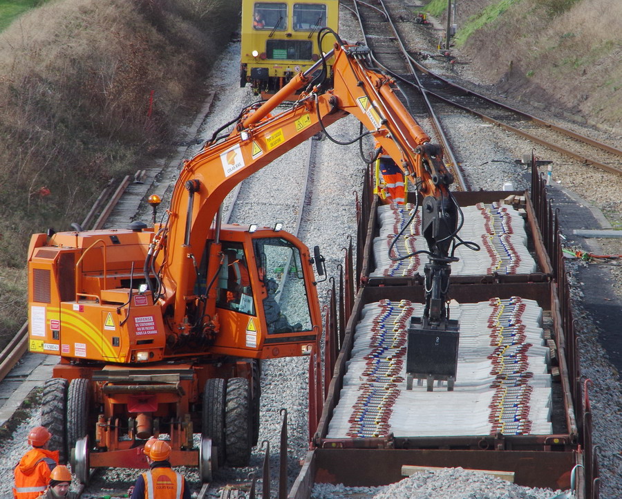 Pour la mise en place d'une sous couche géocomposite drainante par les équipes de Colas Rail,