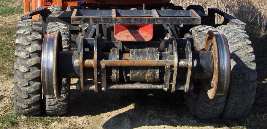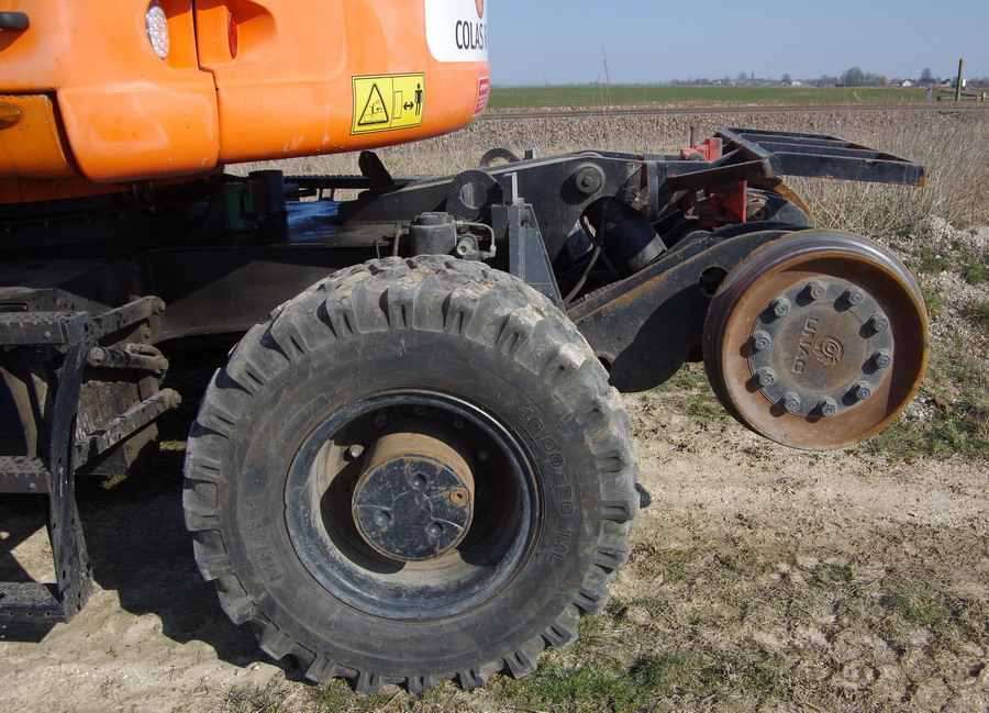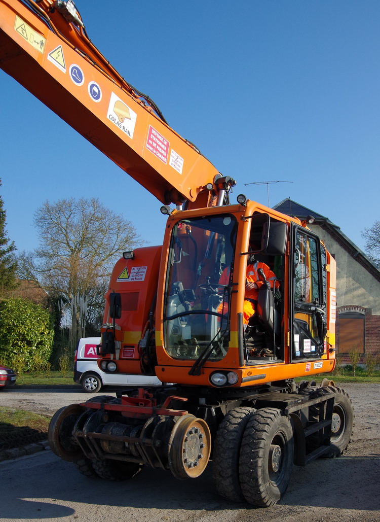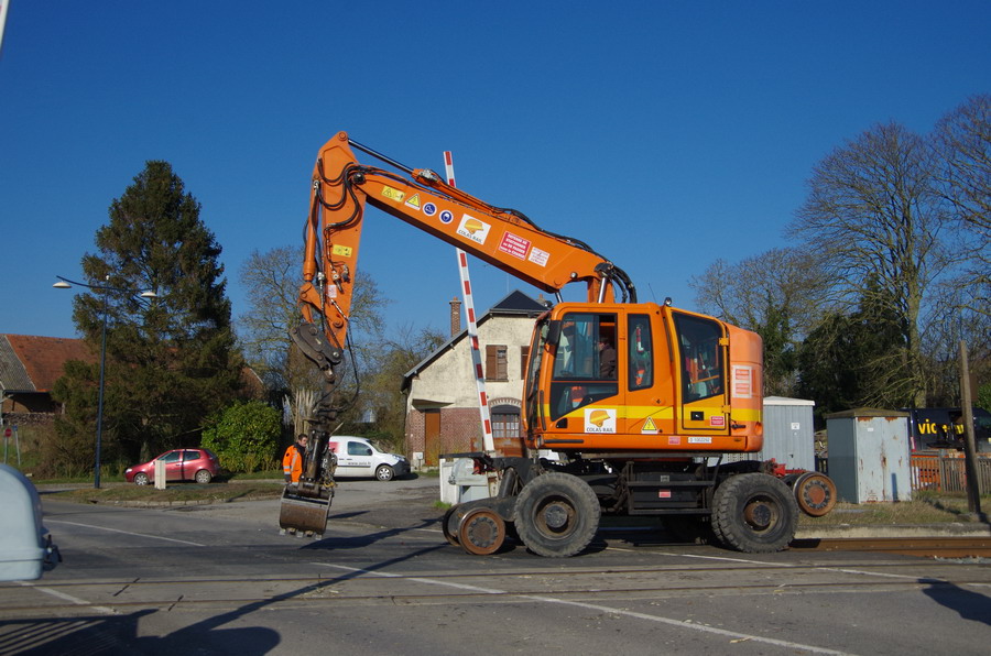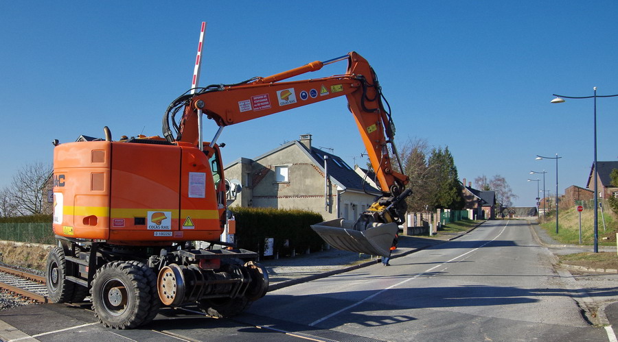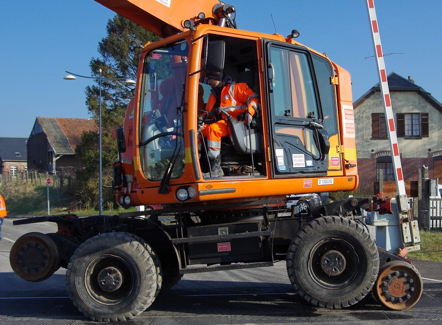 la Pelle Rail-route va se mettre sur les rails elle profite du passage a niveau pour se mettre sur les rail puis elle part sur la zone de chantier