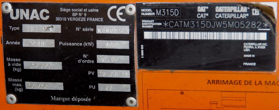 Pelle Rail route 22TRR n°CATM315DJW5M05282 de 2011 n° d'ordre W14 - PV 25-03-2011 pour Colas Rail D100 2292