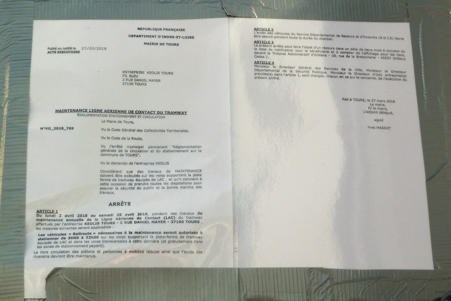 pour la maintenance de la ligne aérienne de contact du tramway de Tours entre le lundi 02 au samedi 28 avril 2018 entre 22h00 et 5h00 du matin effectués par l'entreprise KEOLIS Tours