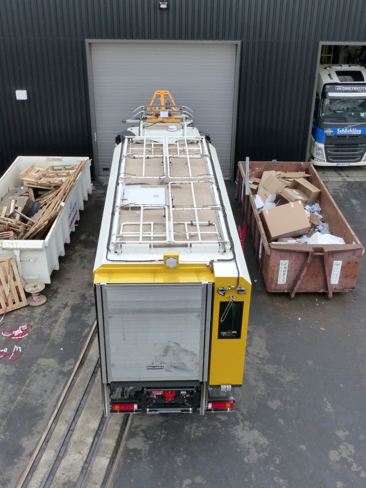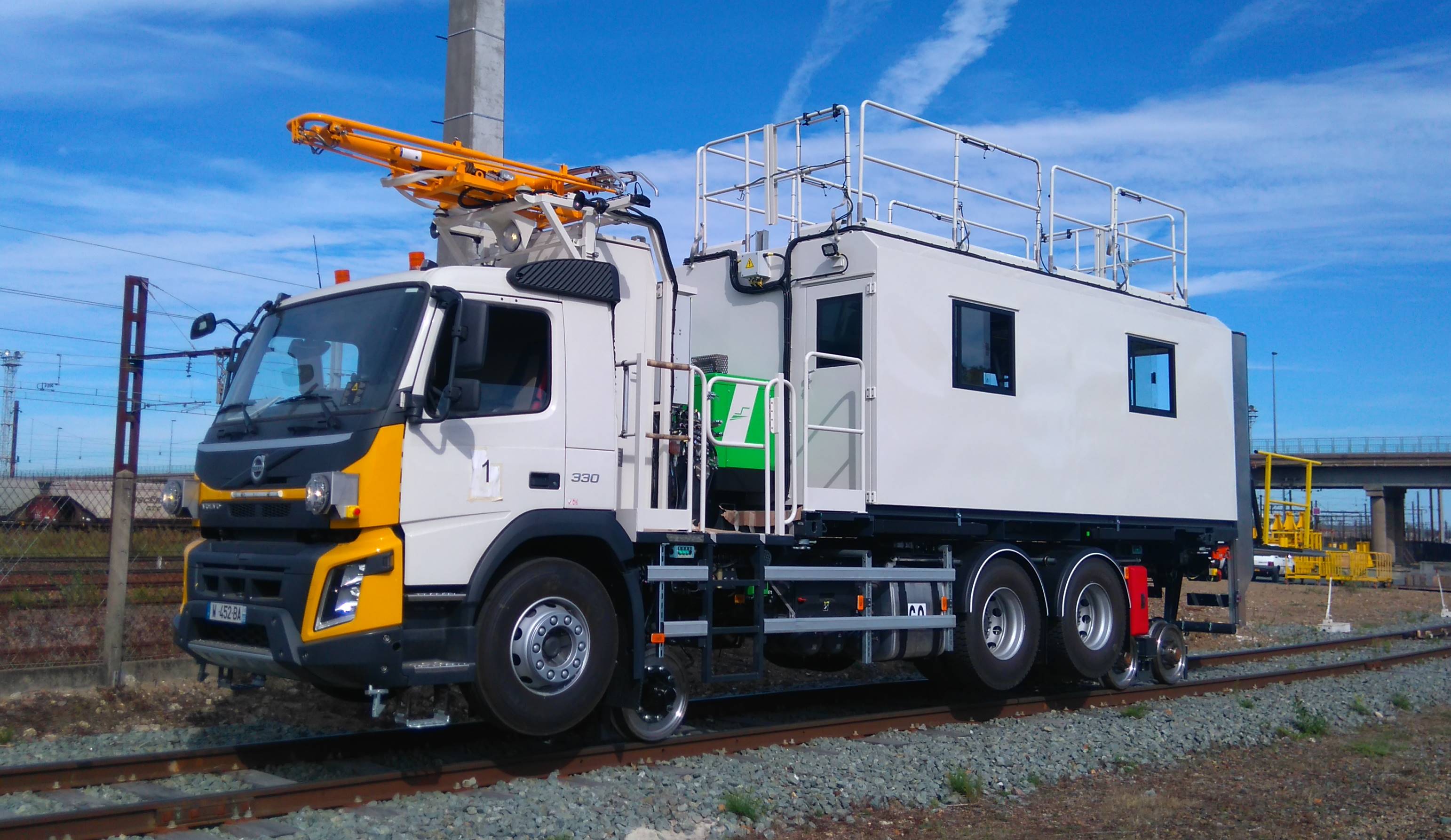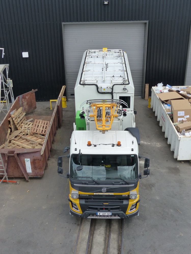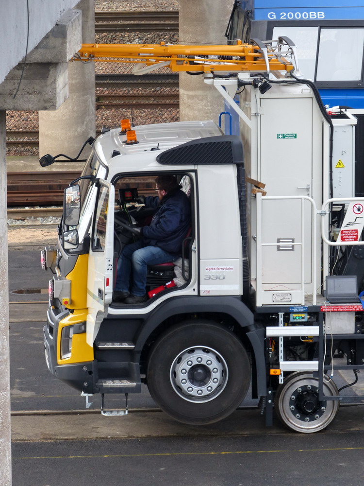 Les roues routières sont maintenues en position haute pour dégager le gabarit ferrroviaire bas, à contrario les rembardes pour travailler sur la caténaire LGV ont été levées.
