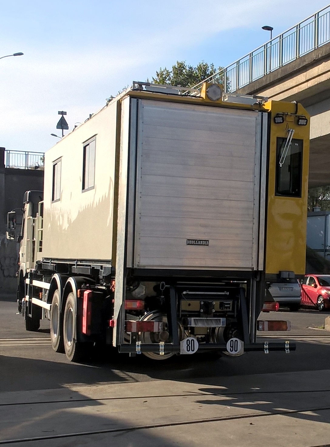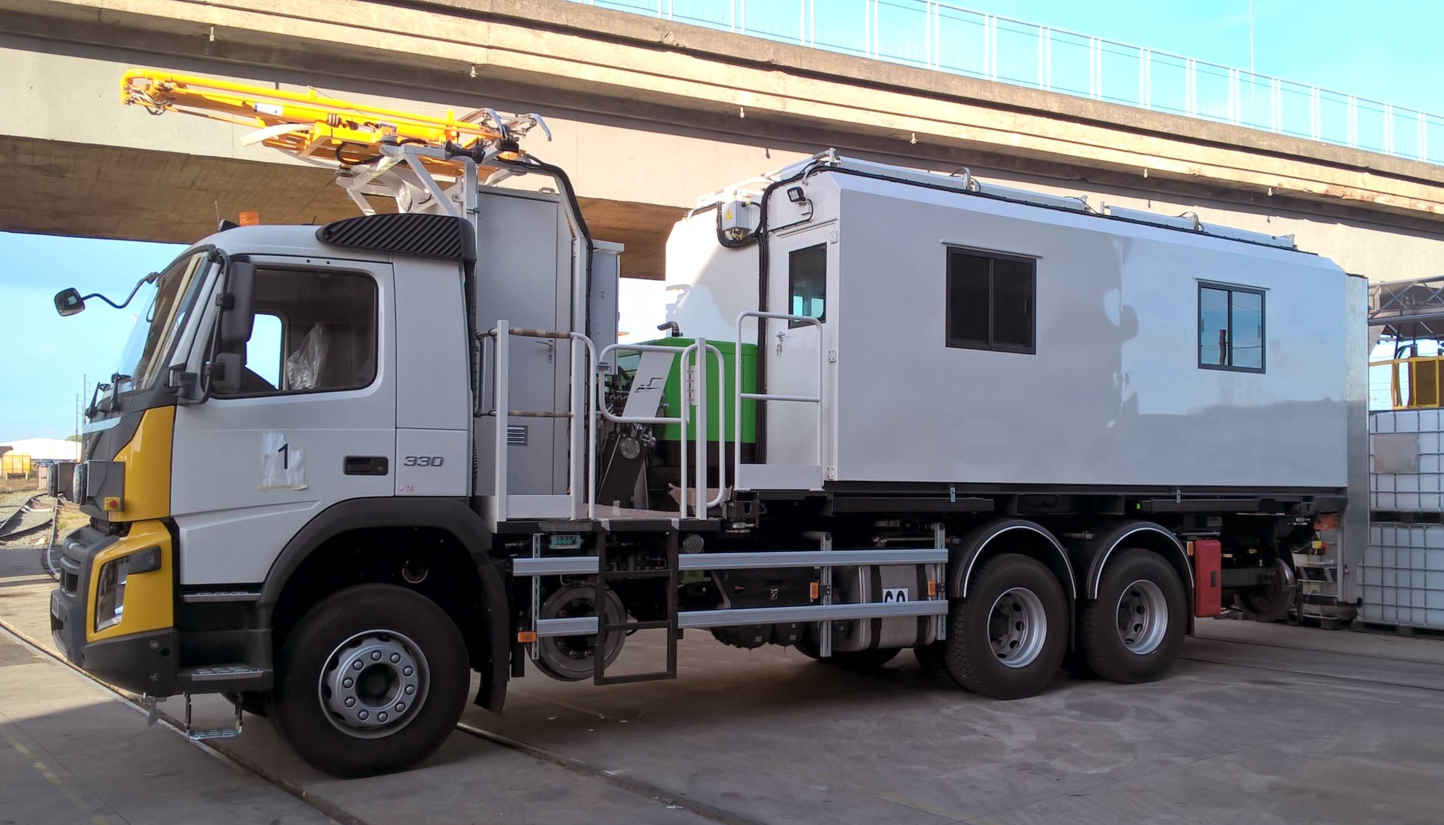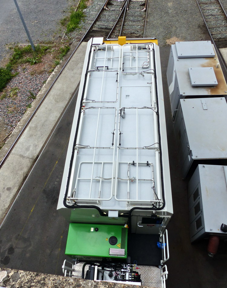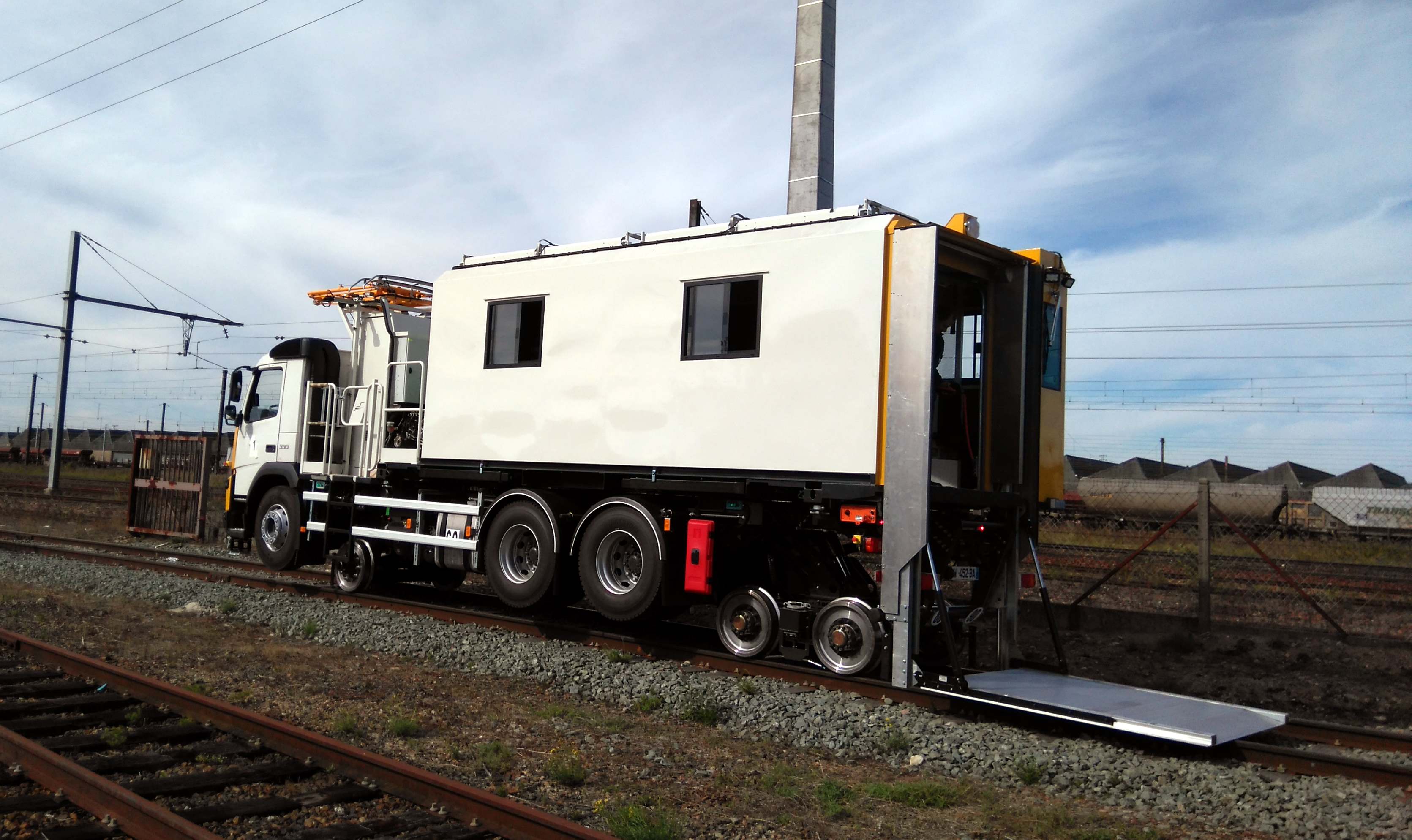 Les roues routières sont maintenues en position haute pour dégager le gabarit ferrroviaire bas, à contrario les rembardes pour travailler sur la caténaire LGV ont été levées.