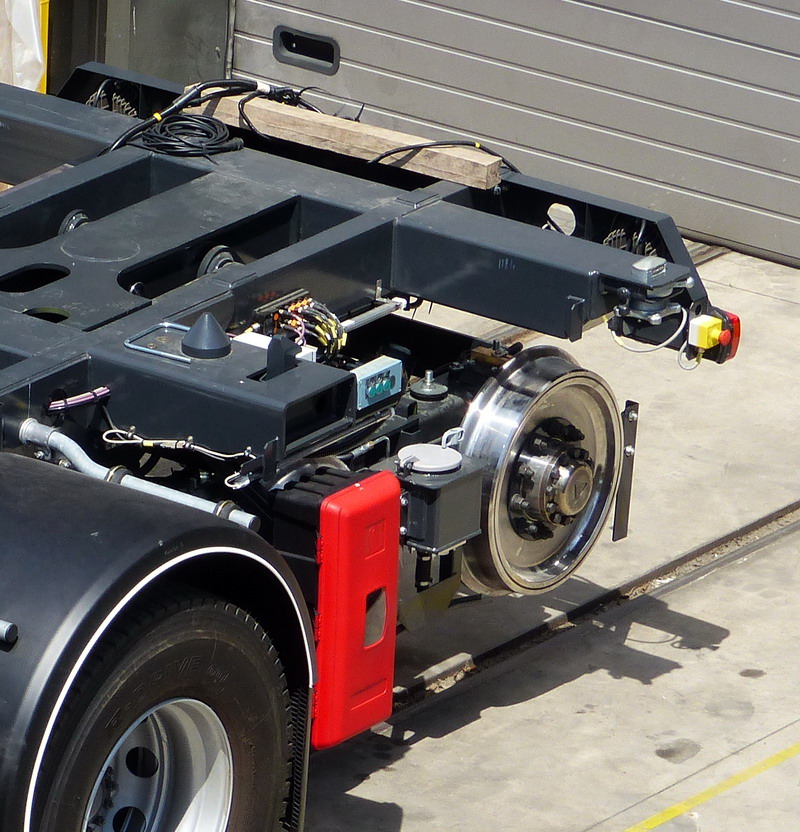 Enraillement en marche AR avec la descente du boggie AR rotatif avec des roues de fort belle taille pour un engin rail-route.