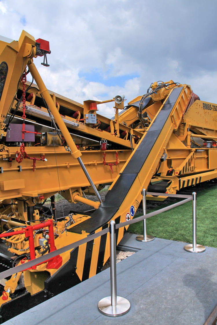 Le RM 85-750 entièrement hydraulique est une machine de nettoyage à ballast pour un fonctionnement sur pistes et aiguilles. La machine est construite dans une conception articulée et se compose d'une excavatrice couplée à une unité de propulsion. Six de ses huit essieux (quatre bogies à deux essieux) sont alimentés par voie hydrostatique pendant les déplacements et les déplacements de travail.