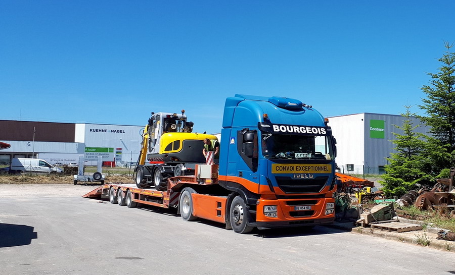 Voici le chargement d'une nouvelle Pelle Rail route à la sortie des ateliers de la société SAS François Pierre à Longvic Dijon (21)