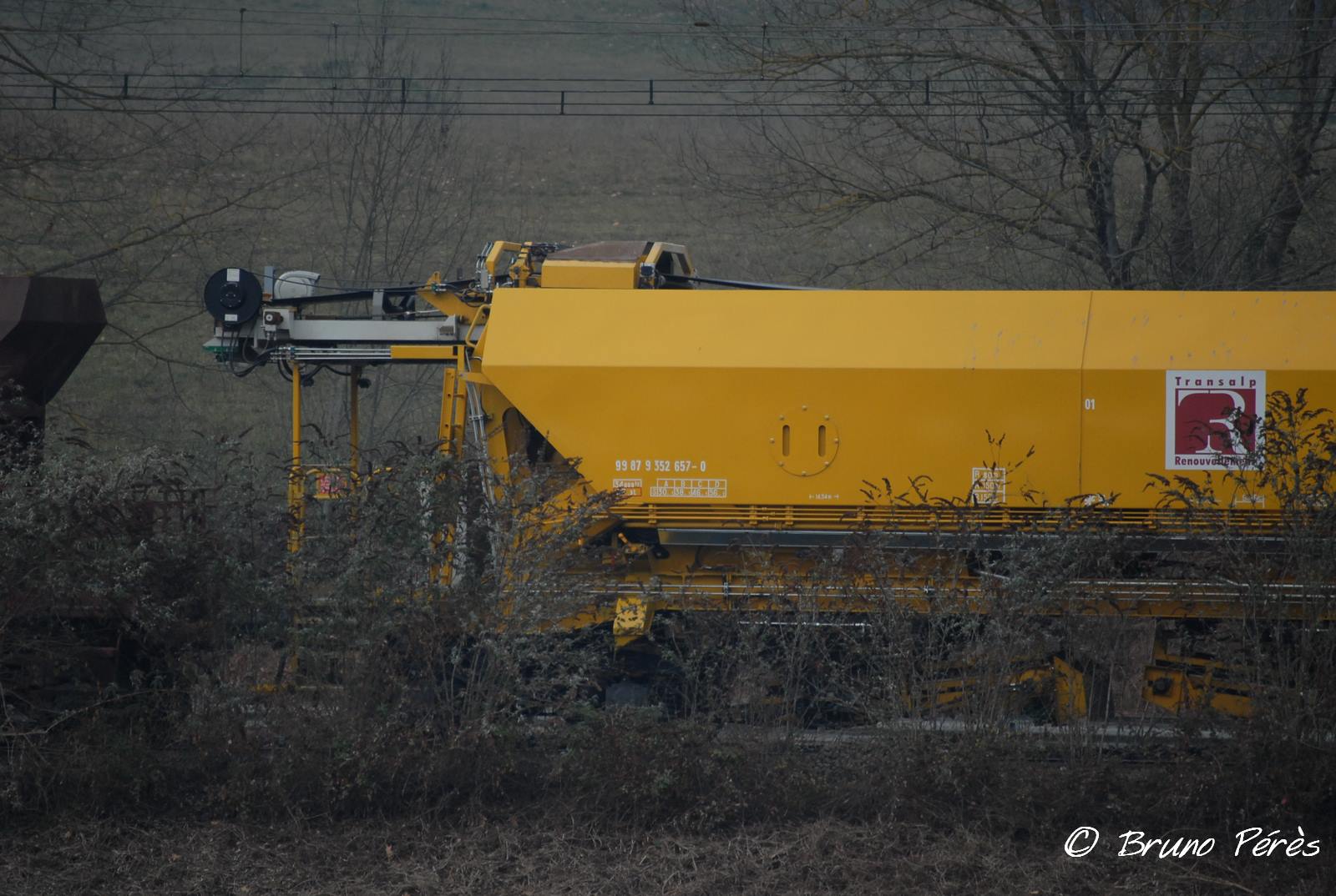 J'ignore son utilité, mais je suppose que sous le châssis se trouvent deux tapis orientables capables de répartir du ballast sur la voie si besoin. Je n'ai hélas pas pu m'approcher davantage (photos prises au télé-objectif).