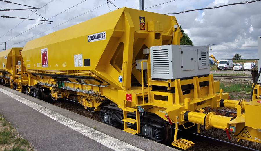 avec deux trémies et possibilité de ballastage, et aussi pour récupérer l'ancien ballast et qui le vide avec les bandes transporteuses