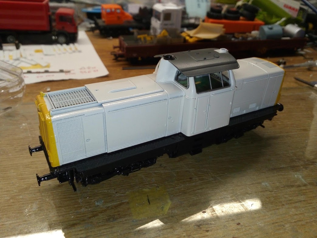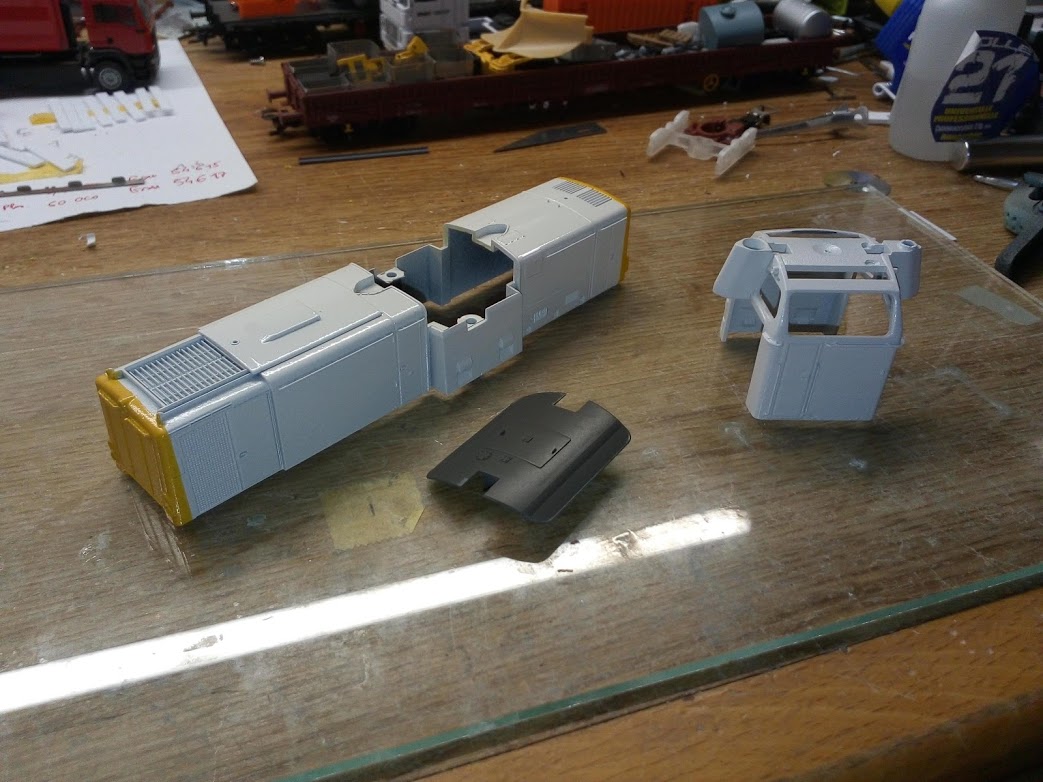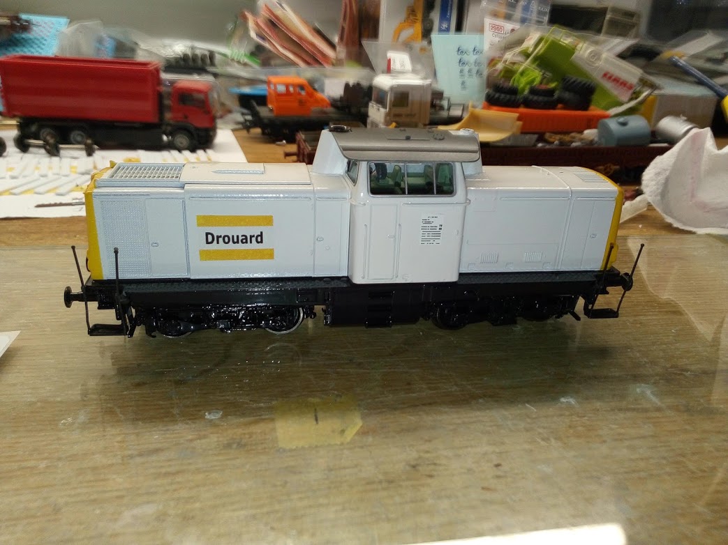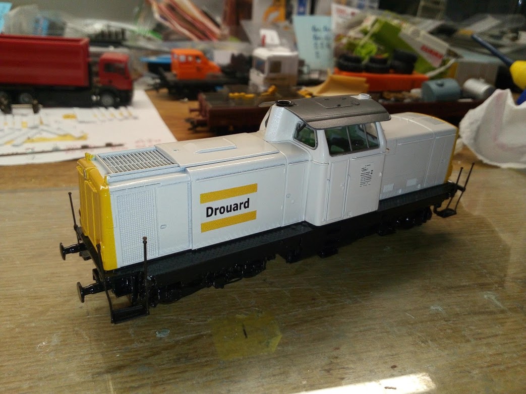après mise en peinture du châssis, de la caisse et de la cabine puis mise en place des décalques (Tchou Tchou pour Drouard) la voici prête a roulé un nouveau train de travaux