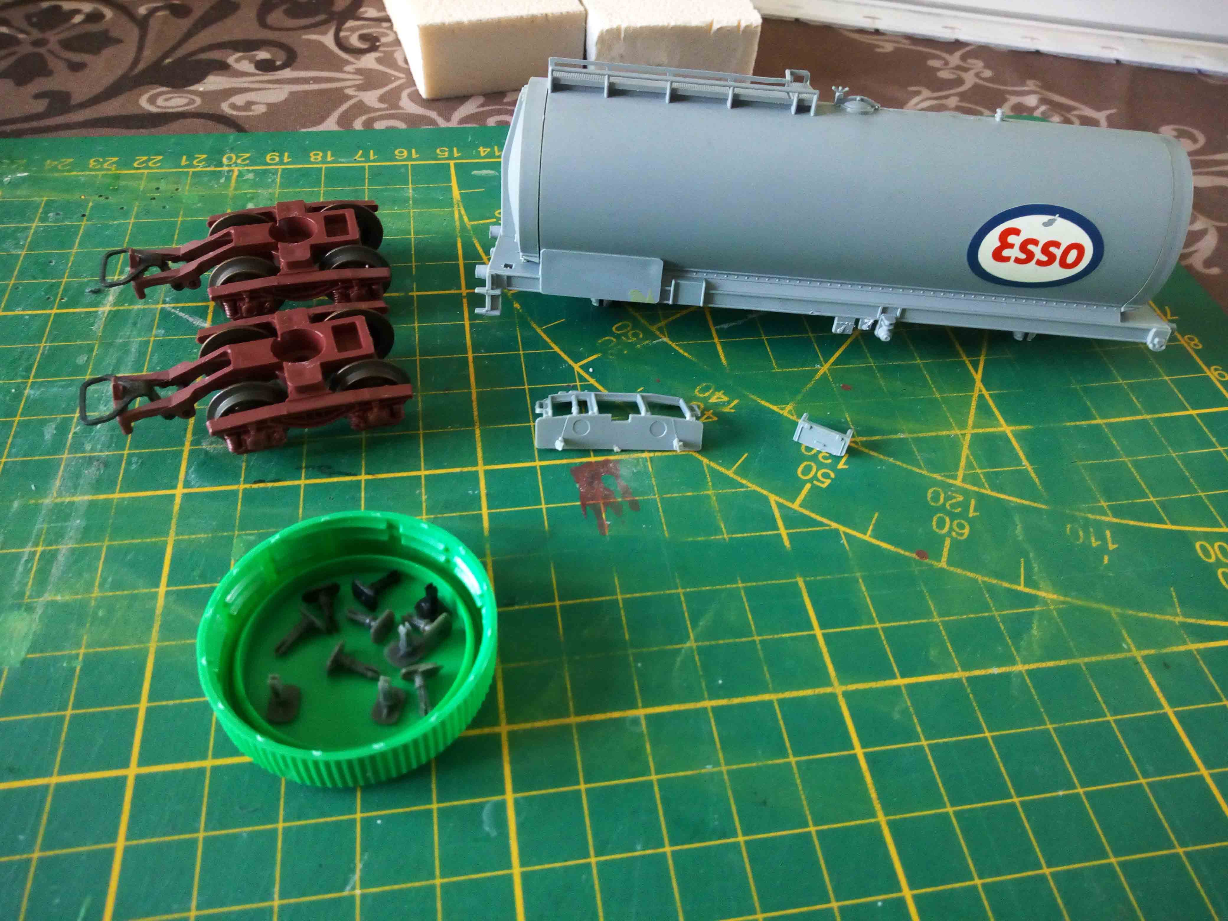 La base, comme indiqué plus haut est faite à partir de citernes Jouef, dépose des bogies et tampons, on vire quelques coffres inutiles