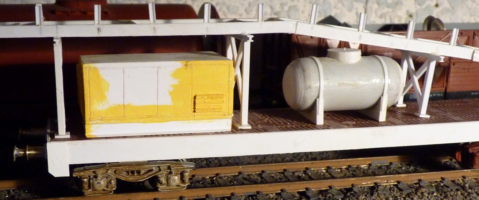 je me ré-attaque à mon wagon énergie , j'ai refait les chandelles qui supportent la bande transporteuse en fer H plus gros ,ce qui est plus conforme à l'engin réel , voilà les photos avec la passerelle en plus