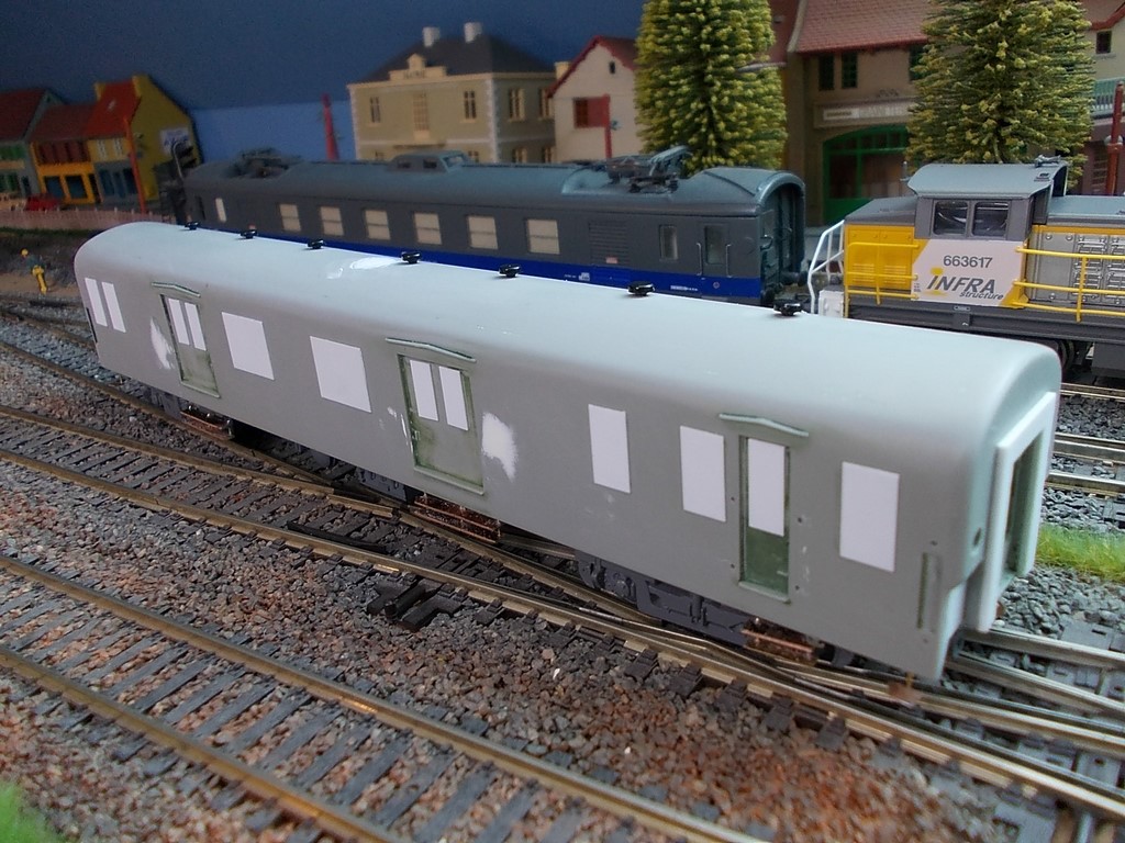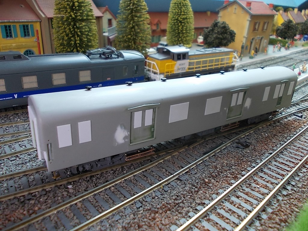 Voici un fourgon de charge souvent incorporé dans les trains de mesures,réalisation toute simple sur une base de fourgon Dev Jouef.La livrée sera en gris 804 et vert 302