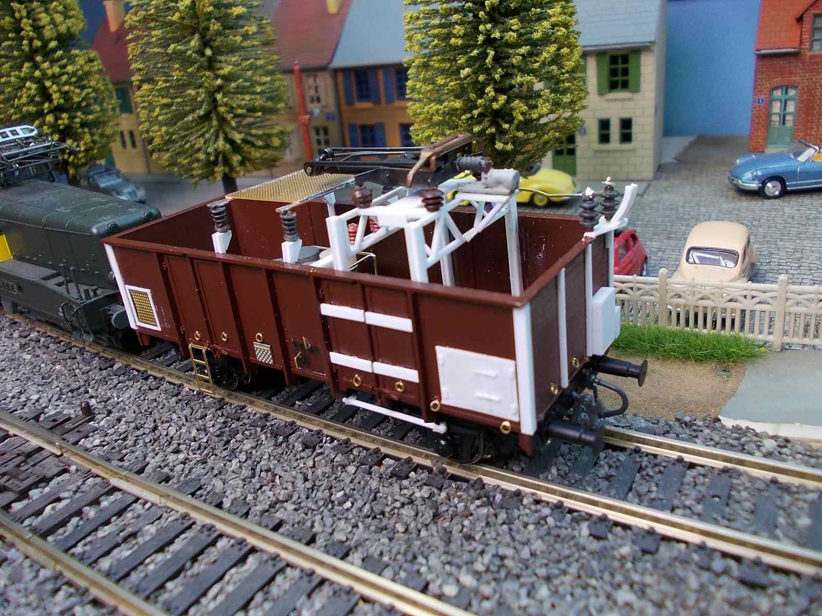 Modèle original reproduisant un wagon tombereau transformé en graisseur de caténaires du dépôt de Thionville dans les années 80.