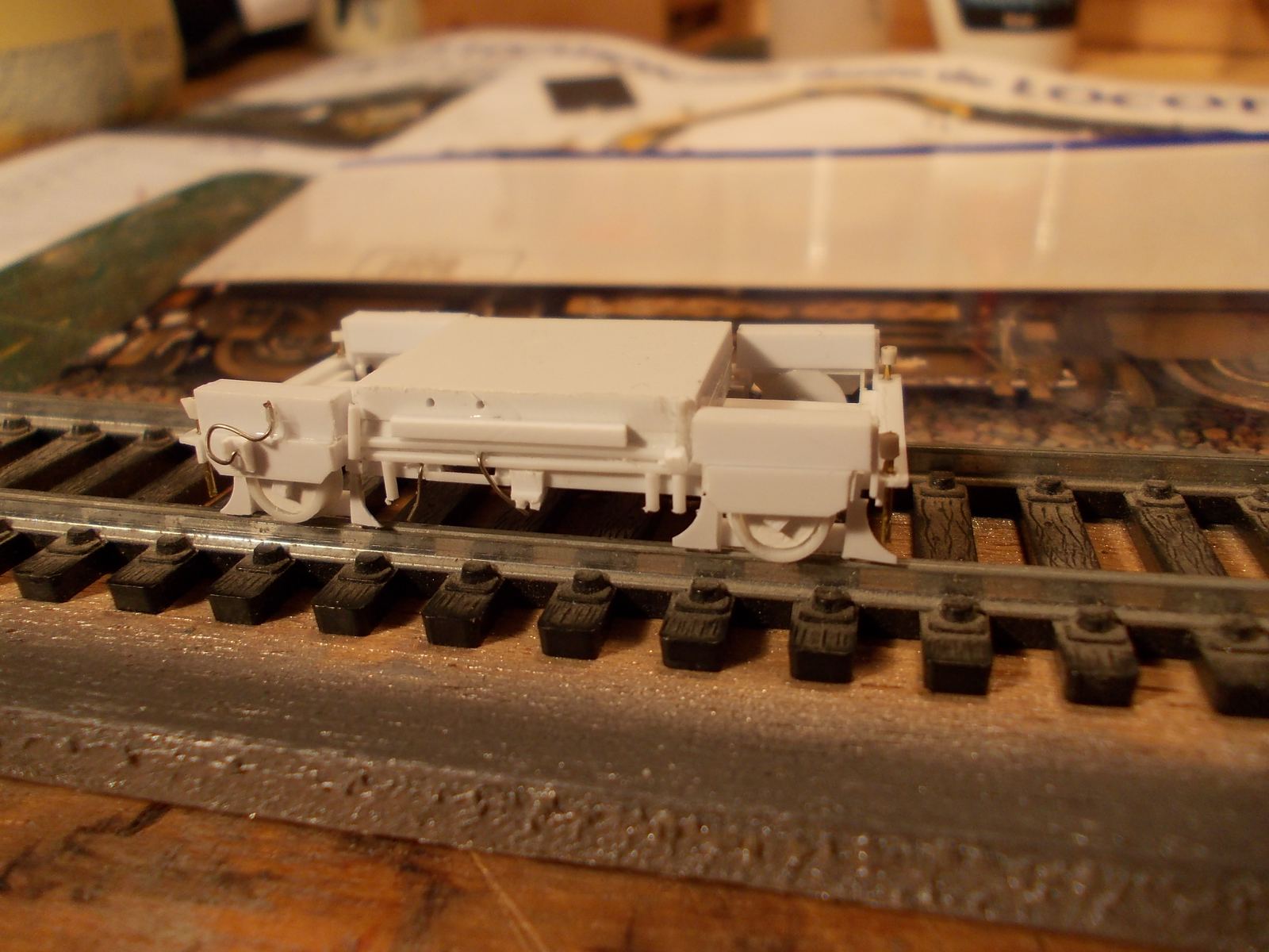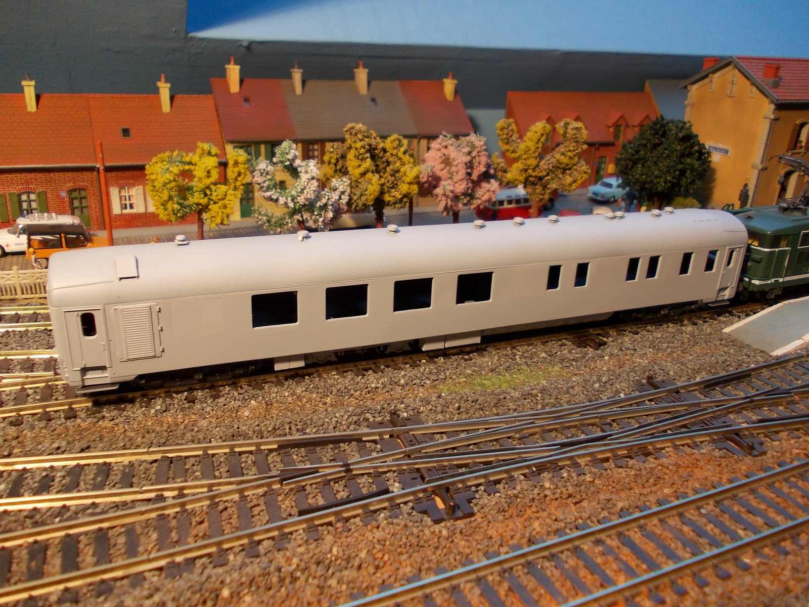 Voici ma dernière nouveauté en cours ,la voiture de mesures V3 , réalisée sur une base A9 UIC Roco. La peinture sera peut être appliquée prochainement car, comme Florian ,je peins en extérieur. En ce moment les températures ne sont pas encore terribles et le retard des finitions commence à s'accumuler :( ,vivement le bon temps. :D