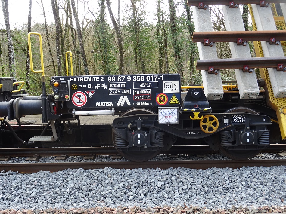 Ce wagon achemine une aiguille de 108 m repartie sur 4 wagons. Préalablement stationné à Poitiers en mars 2023.