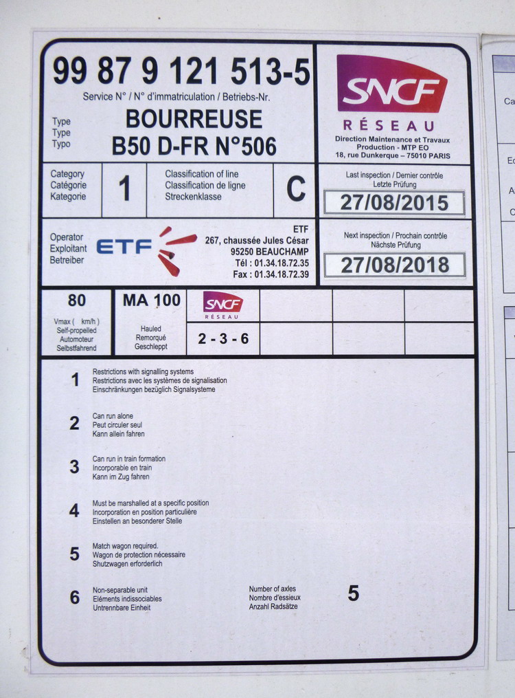 Matisa n°506 - 1992 ex Déhé Cogifer TF - dernier Agrément de travail IPM 02135 n° d'ETF 5200010