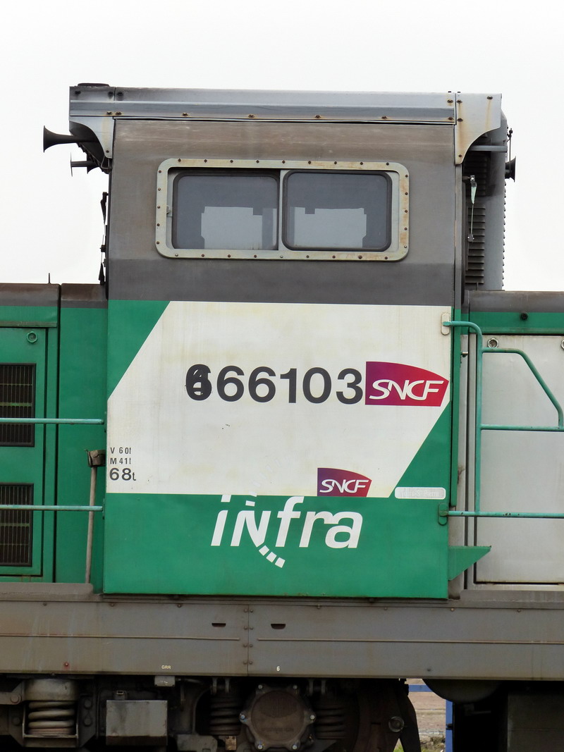 Voici la 466103 Livrée Fret avec logo Infra avec le wagon graisseur de caténaire