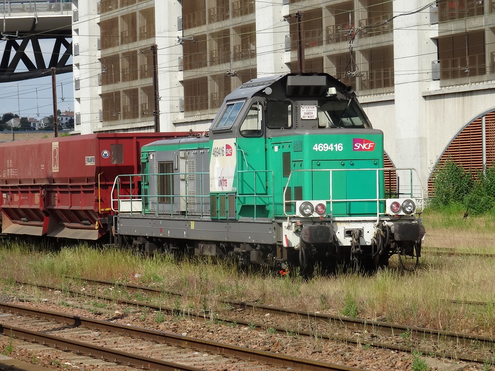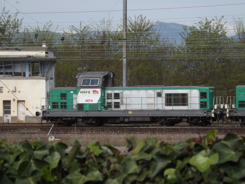 Voici la 469416 Infra avec le logo en livrée Fret (ex 66416 mise en service le 28-12-1968) avec le wagon graisseur de caténaire