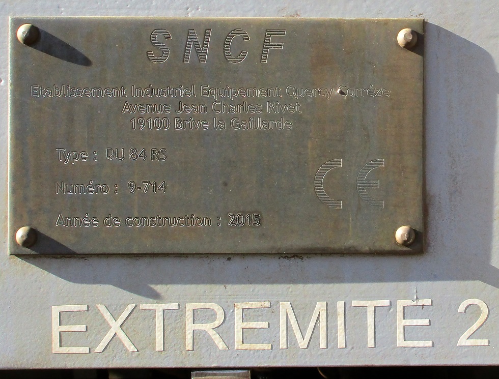 La DU 84 RS 9-714 se trouvait en gare de Tulle (19) en compagnie d'une autre machine (DU 94 LGV) mercredi 21 septembre 2022. Faute d'autorisation par le personnel sur place, je n'ai pas eu la possibilité d'approcher pour de meilleures photos. Les agents m'ont tout de même renseigné sur la présence des draisines : pas de travaux prévus, simples essais en ligne entre Brive et Tulle après révision (sortie d'atelier).