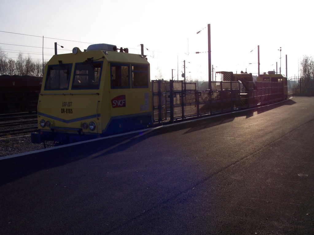 Bonsoir, voici 3 photos de la première draisine voie pour la LN6 (TGV Est), il s'agit d'une DU 94 LGV et d'un wagon pilote. La grue est une grue de 22 T/m. L'outillage se compose d'une pince à rail pour poser des coupons de 18m, une pince à traverses, un godet preneur, un électro- aimant...