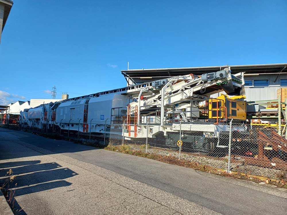 CGF, il y a 2 cabines, l'alimentation, la réserve de carburant et la génératrice électrique se trouvant derrière la chaîne de dégarnissage par rapport au sens de marche. Elle ne possède qu'un seul crible, a priori comme celle d'ETF.