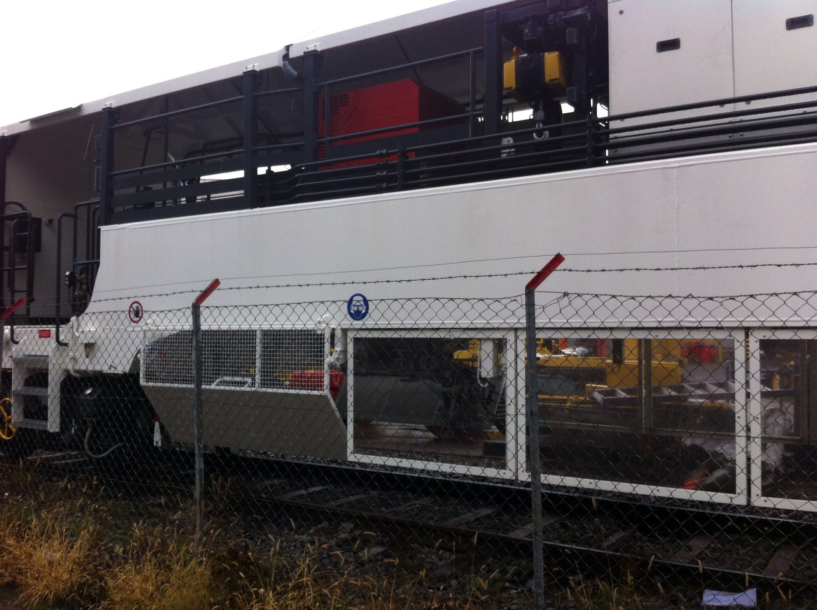 A l'intérieur : Nous pouvons voir les outils, l'énergie, les cabines, les sièges pour les ouvriers, l'extraction des gaz de soudure, le treuil pour manipuler les traverses et leurs points de stockage de part et autres du treuil. les trois treuils pour les coupons de rail (par fil de rail) six en tout.