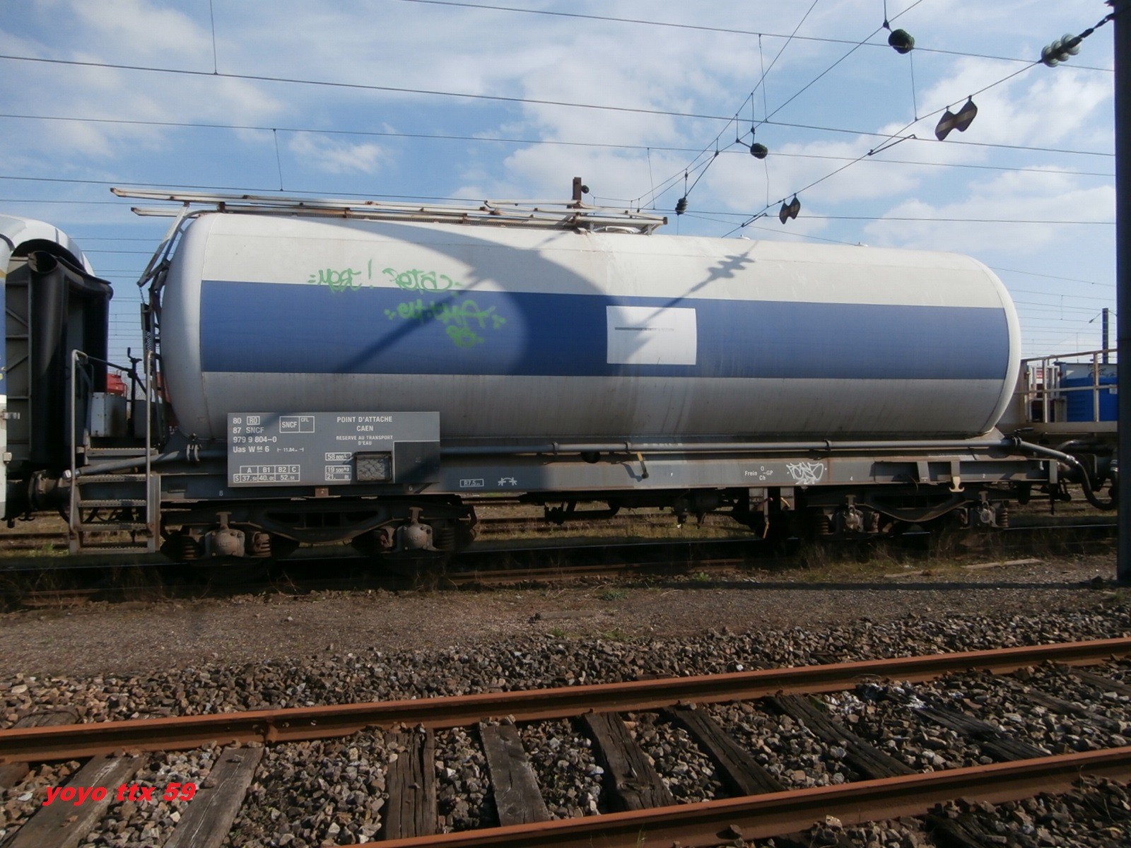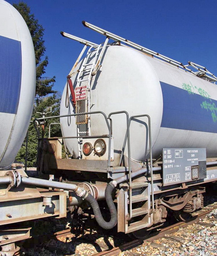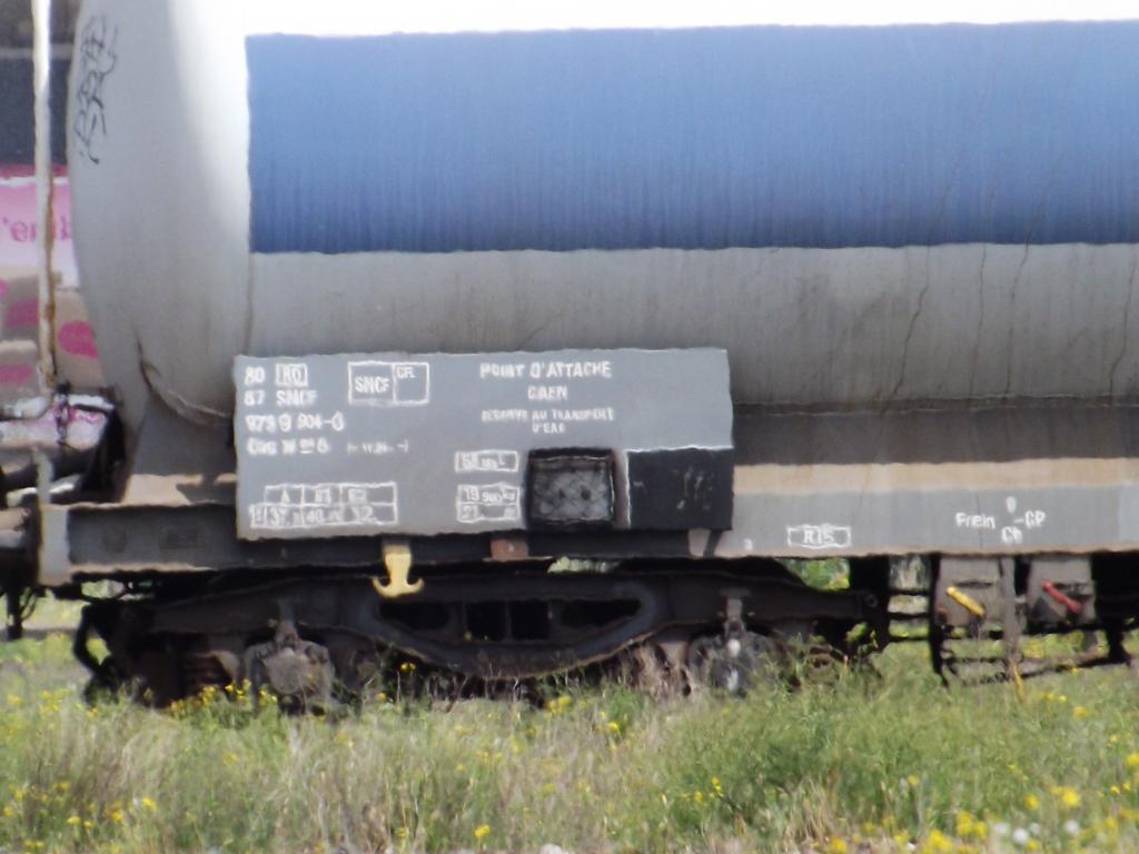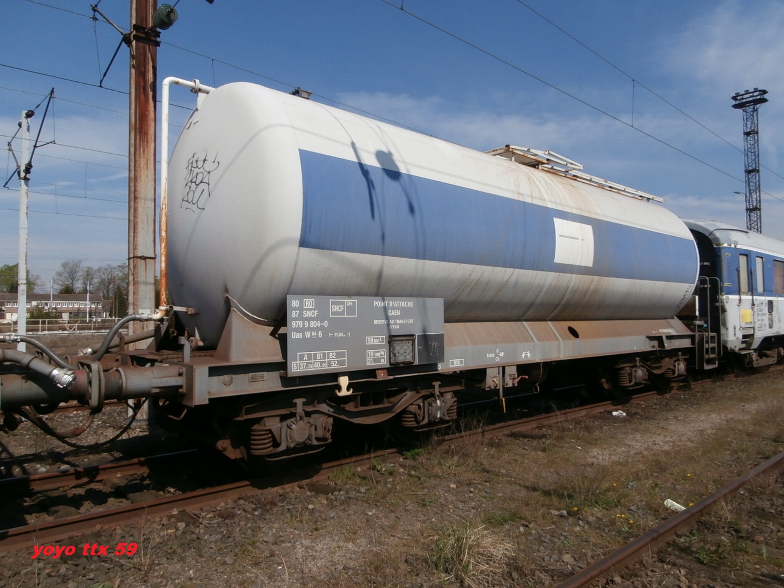 Voici le wagon citerne 80 87 979 9 804-0 Uas W64 6 SNCF-RO - Point d'attache Caen dans une rame laveur d'isolateur Ã