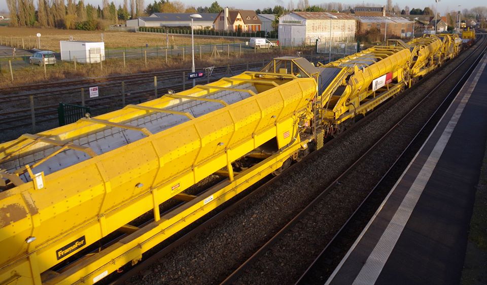 Le voici sur la rame de TTX n°XDK1 avec la Dégarnisseuse RM 95-800 AHM Meccoli au niveau du pont de Bray