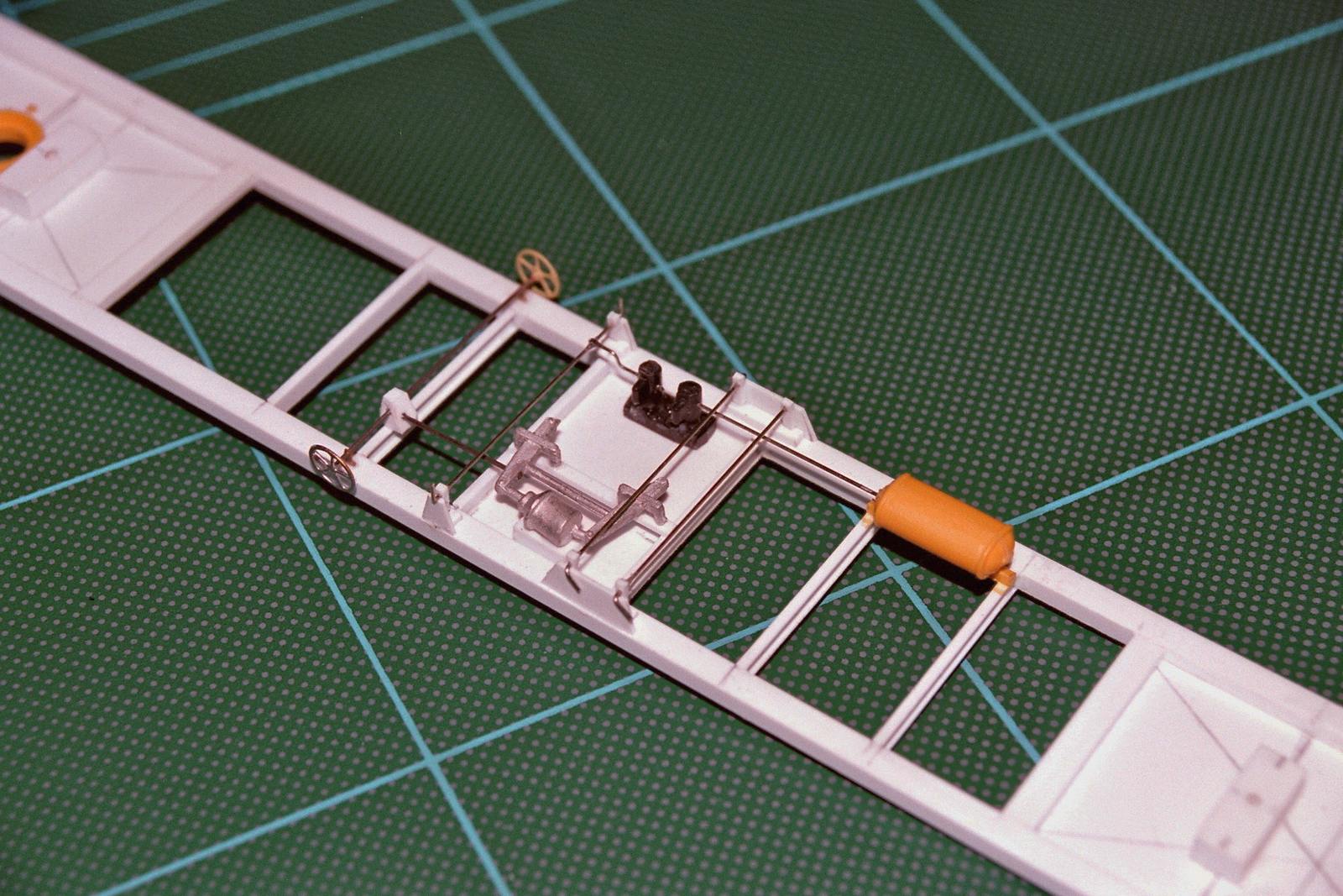 Ca avance un peu: passage d'une couche de primaire gris en bombe sur les chassis (Tamiya pour plastique et métaux: très fin et l'avantage de pouvoir s'appliquer sur PVC, laiton, maillechort, métal blanc).Ce primaire a l'inconvénient de foncer les teintes Tamiya TS qui ont une certaine transparence.