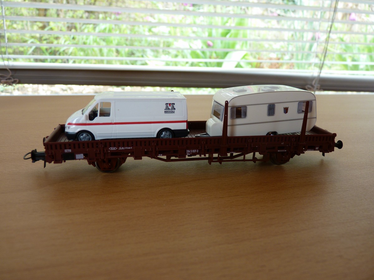 voir aussi en rubrique wagons plats à essieux ou j'avais posté des wagons LdKKS chargé de caravanes et remorques sanitaires.