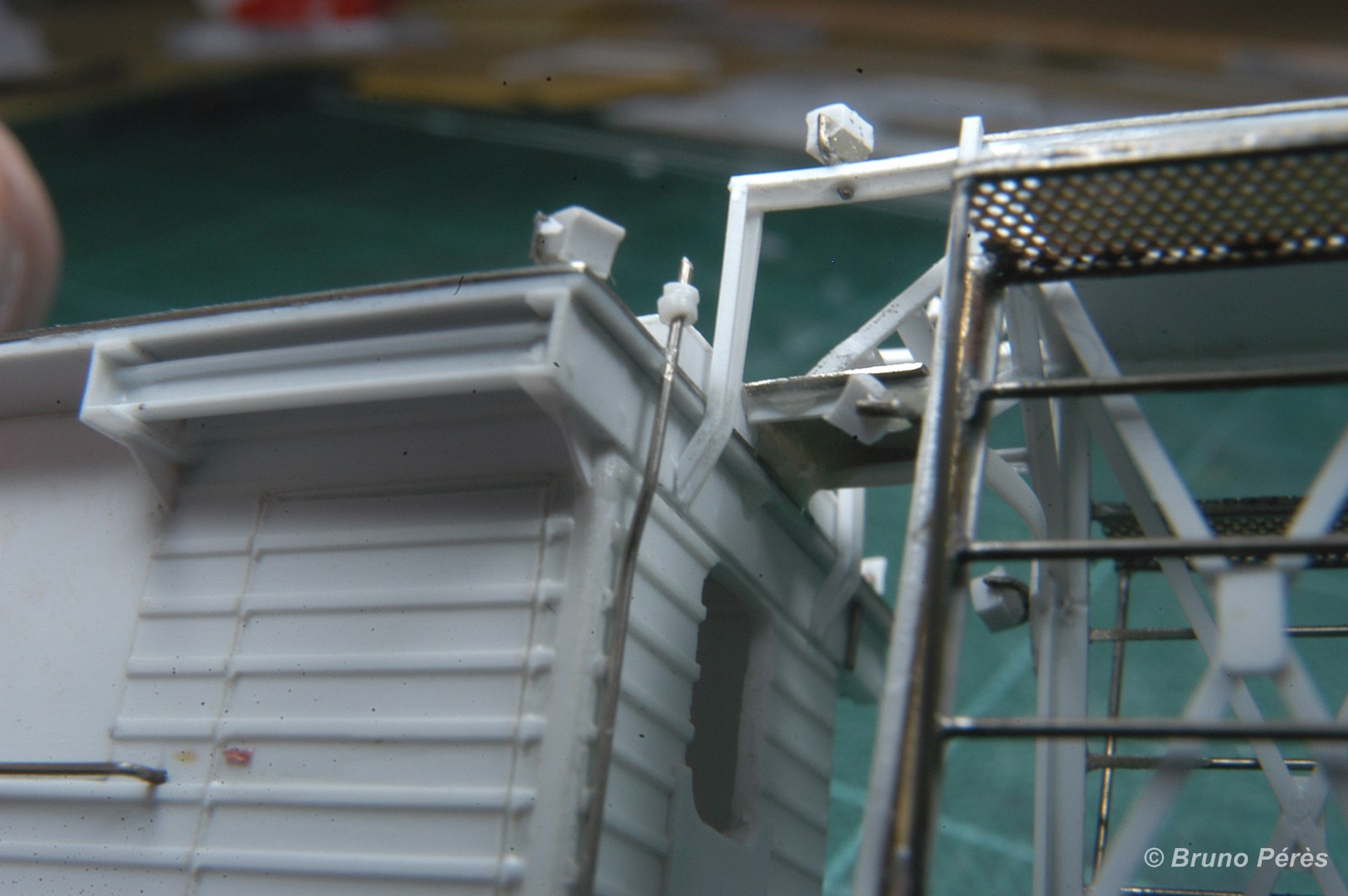 Il ne s'agit pas des projecteurs que j'ai d'ailleurs reproduits et qui sont en place (cf page 3), mais d'une petite plateforme supplémentaire présente au dessus du bungalow, voire de la présence de rambardes repliables sur les plateformes principales.