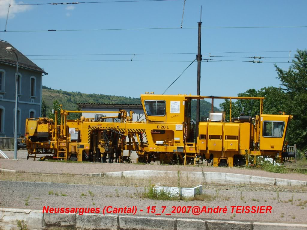 Photographiée en vitesse entre deux trains, voici la Bourreuse B 20 L de l'EVEN Auvergne surnommée "La Galinette" stationnée voie 2 en gare de Neussargues (Cantal).