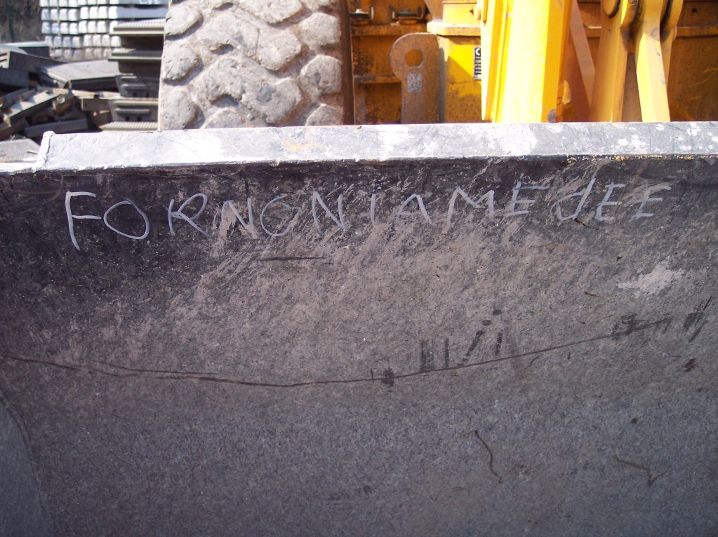 Il arrive que certains godets soit gravés avec un n° interne ou un nom d'entreprise, ces infos peuvent être symplement marqué avec un coup de bombe de chantier.