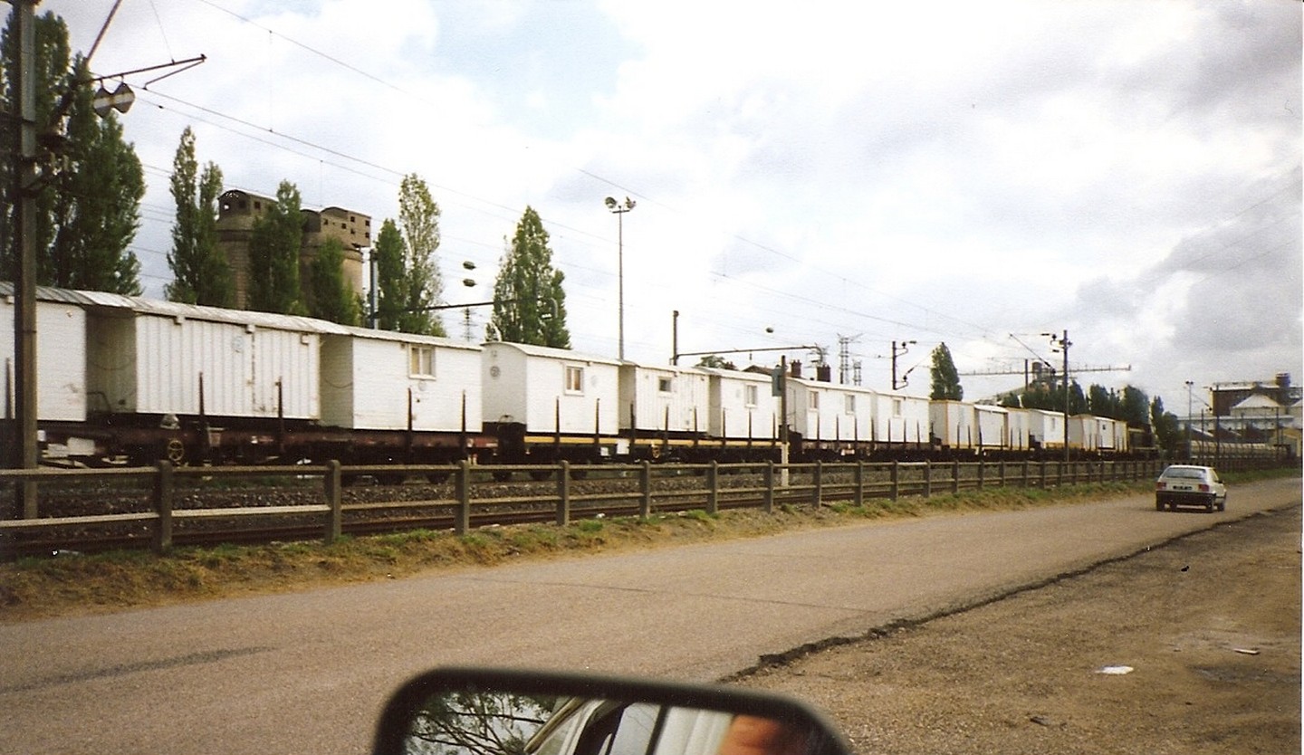 Voici deux photos d'une rame de bungalows TSO chargés sur des wagons plats tractée par un 63000