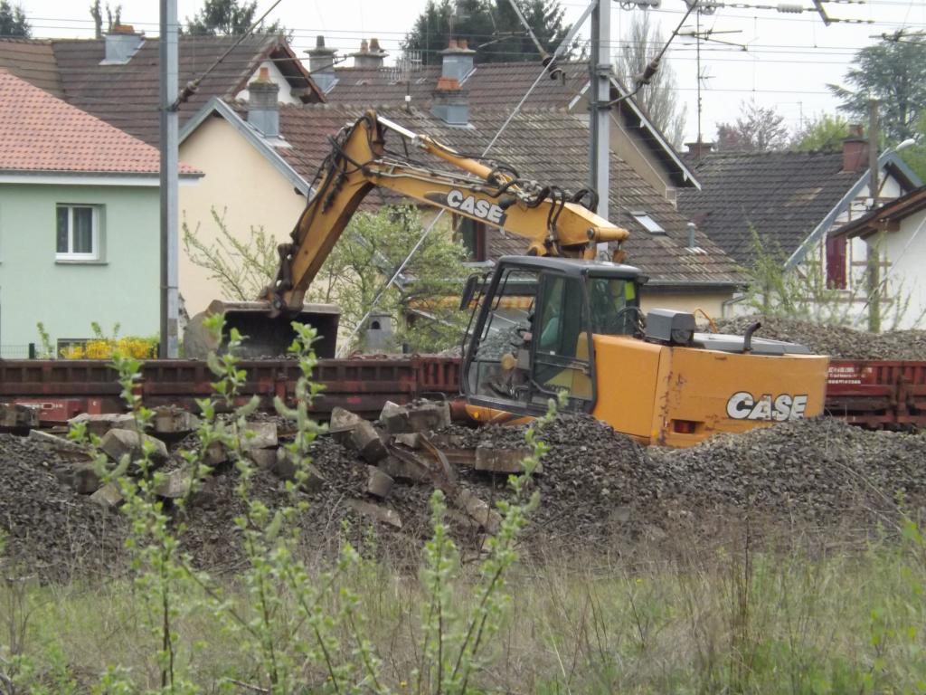 le vieux ballast est bien déchargé à Danjoutin et c'est une pelle rail route qui décharge