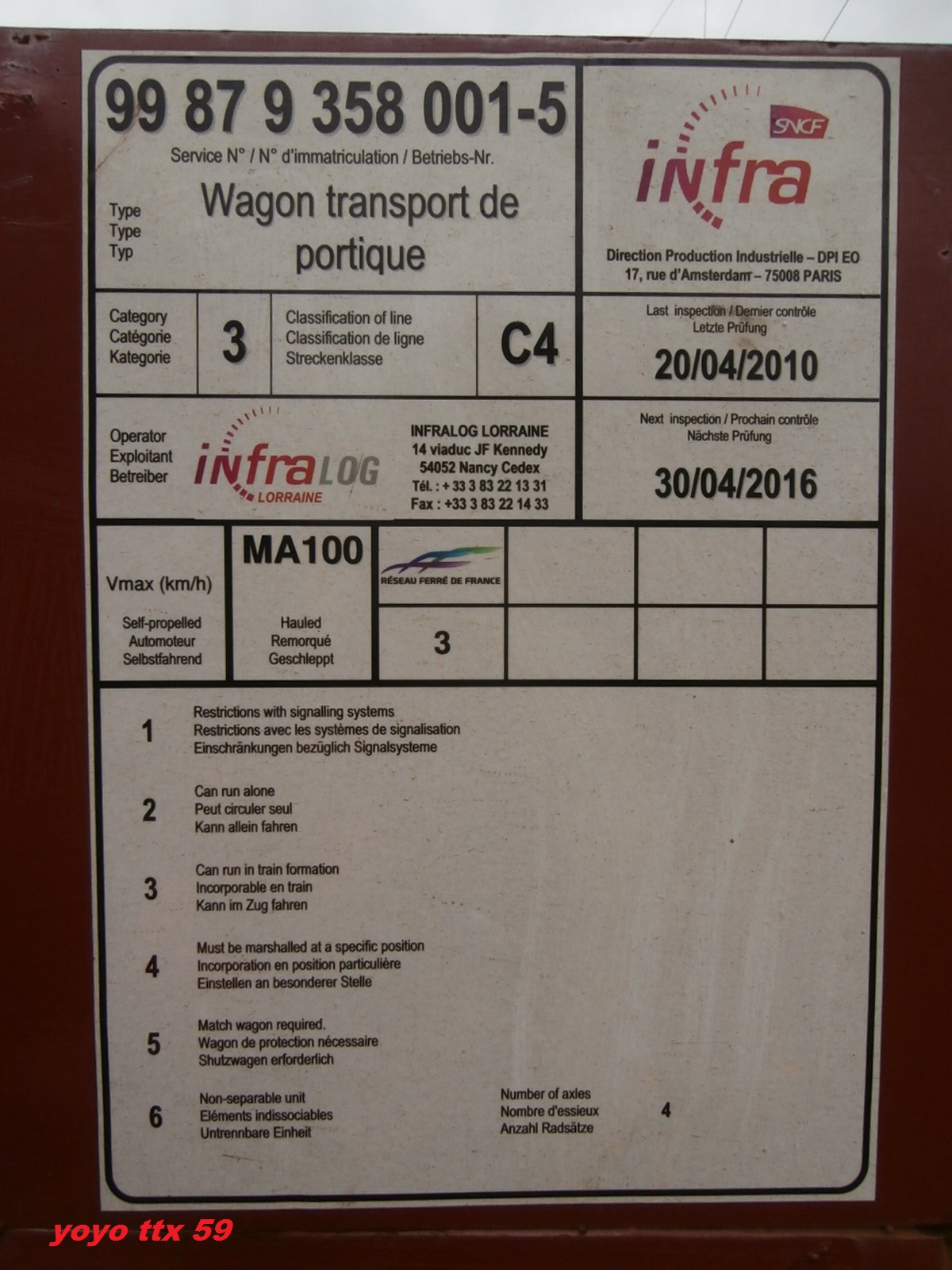 .Voici les nouvelles immatriculations des wagons.99 87 9358 001-599 87 9358 002-399 87 9358 003-1Ces trois wagons transportent les " PMC 1 , PMC 2 , PMC 3 ".Maintenant a voir si il n'y a pas d'autres triplettes de portiques