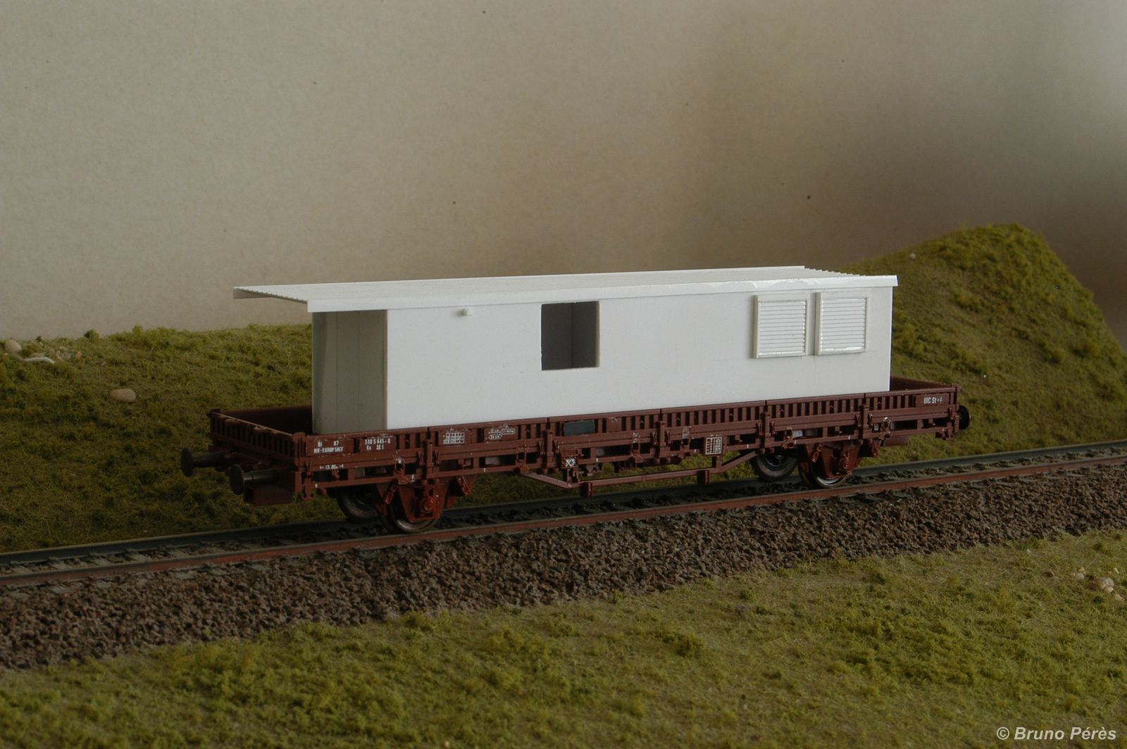 Voici un wagon plat porte bungalow de la suite MRT de Toulouse. Le vrai se trouve ici. Il va avec le wagon porte caleuse, lui aussi appartenant à la suite MRT toulousaine.
