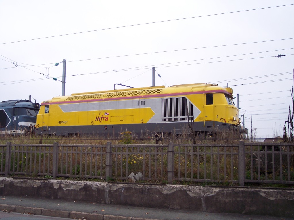 en compagnie de la BB 67412 Infra qui arrivait de Montbéliard avec plus de 30 wagons vide mais qui en à laissé la moitié a Belfort pour continué son chemin sur Giromagny