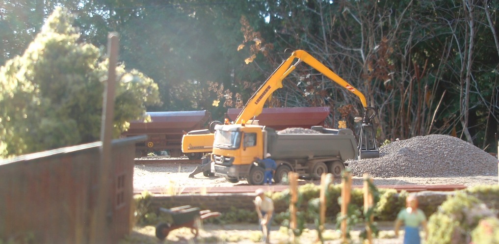 Petit chantier de voie dans le secteur. Une pelle Liebherr 934 de manutention avec benne-preneuse est au chargement des trémies... L'appro. du stock de ballast est assurée par un Actros 8x4 benne...