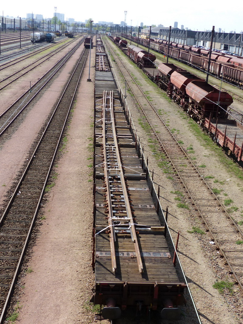 Voici un appareil de voie sur 3 wagons plats sur les voies de garage des rames Infra/SNCF de Saint Pierre des Corps