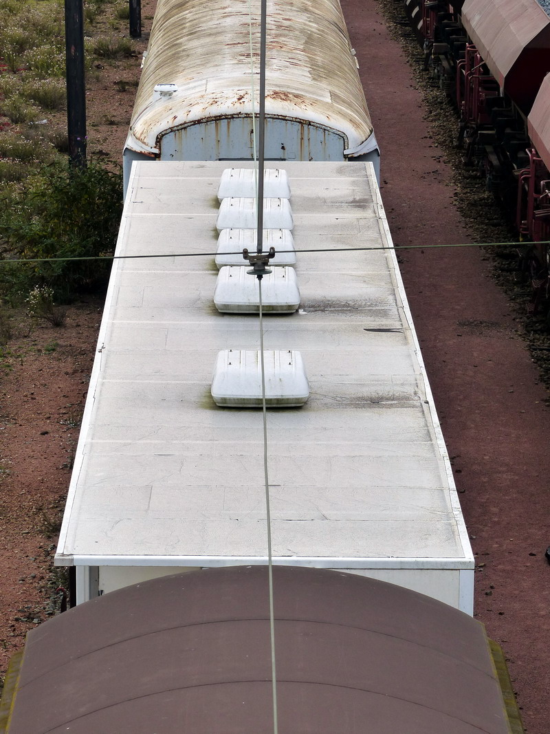 Voici le wagon 80 87 977 4 502-9 Uas R39 6 SNCF-PSL avec son bungalow entre la voiture de cantonnement RVB